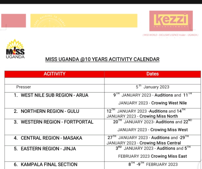 The search for the next beauty queen will start in Arua from January 9th to 11th and on to Gulu from January 12th to 14th, Fort Portal from January 16th to 18th, Masaka from January 19th to 21st, Jinja from January 26th to 28th and then to Kampala for the final pre – selection from February 1st to 2nd.