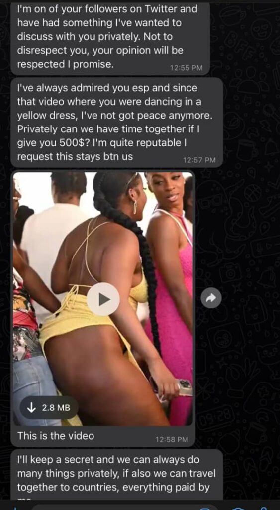 He then sent her the video and requested that if she accepts to give him some sumbie, the secret will only remain between just the two of them.