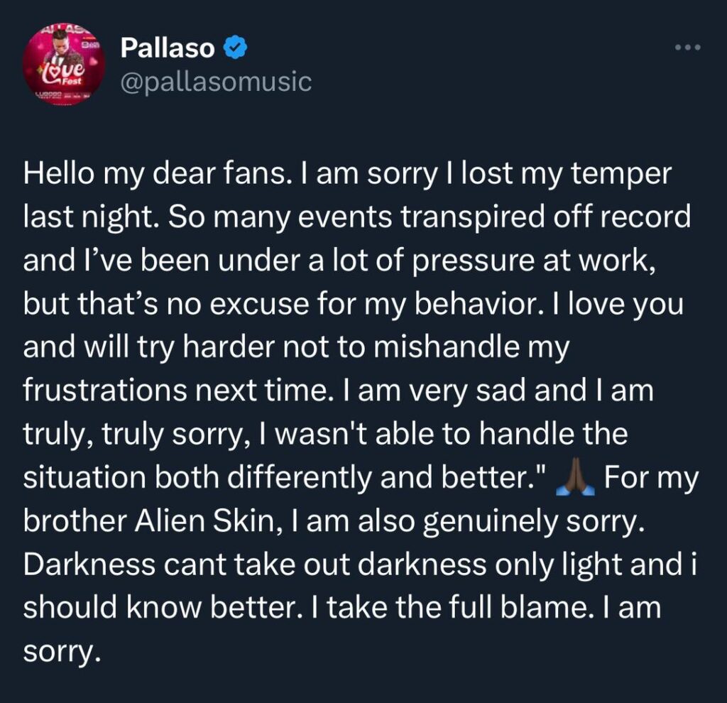 “Hello my dear fans. I am sorry I lost my temper last night. So many events transpired off record and I’ve been under a lot of pressure at work, but that’s no excuse for my behavior. I love you and will try harder not to mishandle my frustrations next time. I am very sad and I am truly, truly sorry, I wasn’t able to handle the situation both differently and better.” For my brother Alien Skin, I am also genuinely sorry. Darkness cant take out darkness only light and i should know better. I take the full blame. I am sorry,” Pallaso
