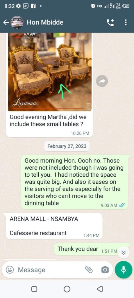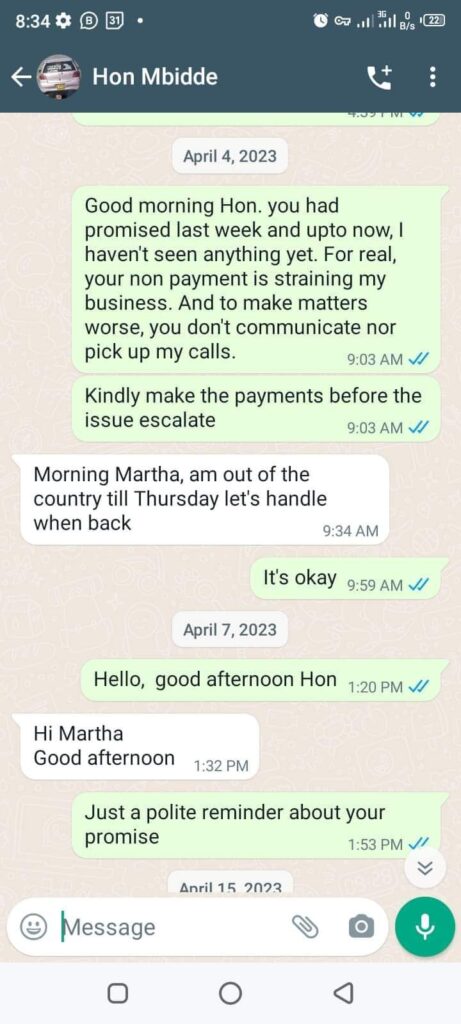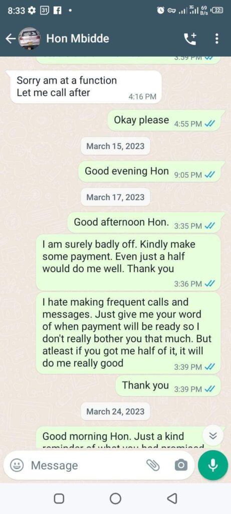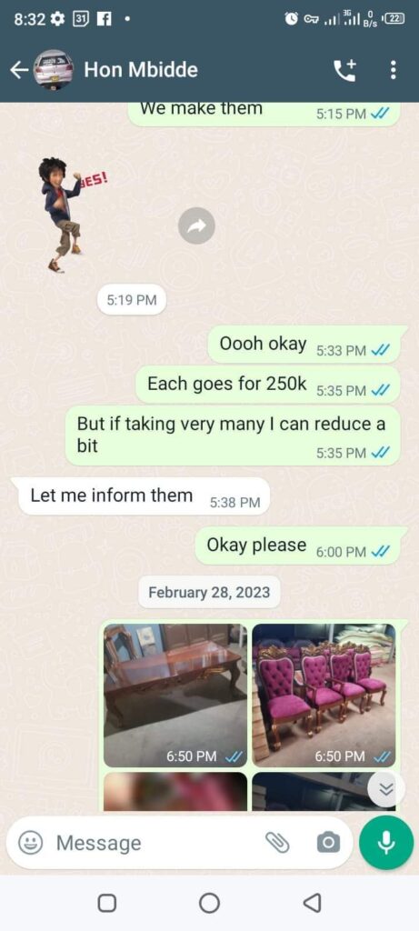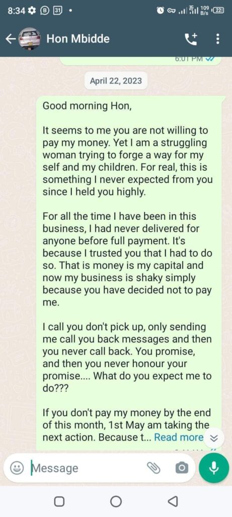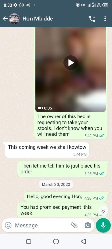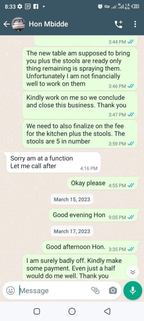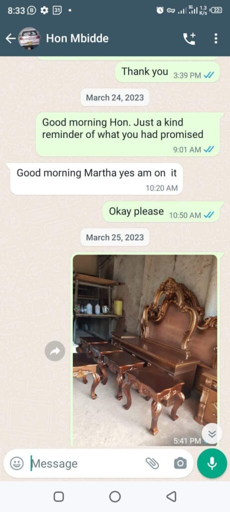 Martha is my name and I am a carpenter by proffession. Around December I was contacted by Hon Mbidde to make him furniture for his home. However, during that time I requested him to give me some time till Jan as I had just given birth (C-section) and I had barely made a month. So when jan reached, we started business as agreed. By end of Feb, I was through with everything and had supplied them to him.