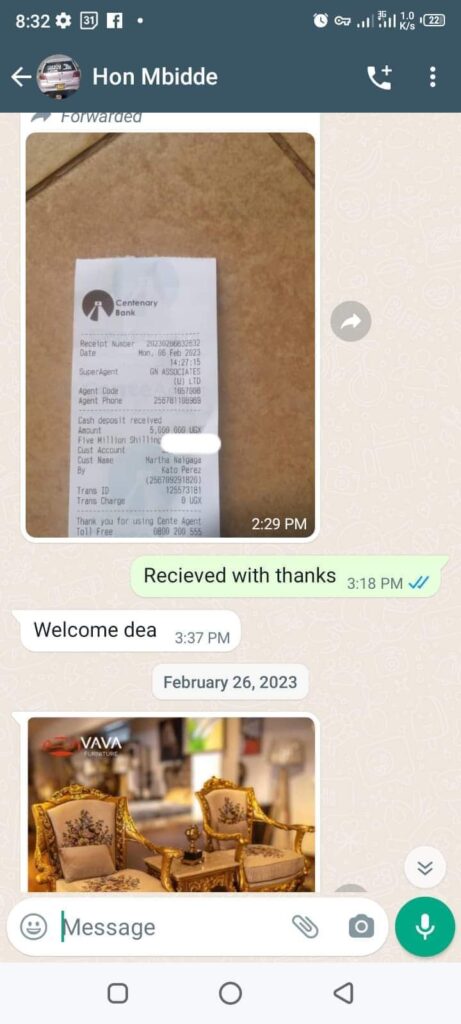 Kindly note that the money he deposited first was 2m cash, Followed by 5m via my bank and then 2m via mobile money. However, he is left with a bal of shs.11,250,000/=. This is less the stools I still have at my place. (Came in after I had already made and delivered the other items).