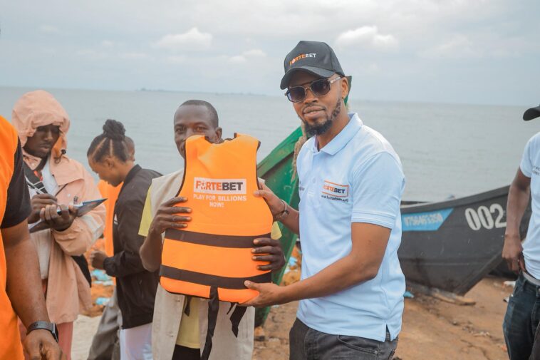 ForteBet, represented by the company brand ambassador, Alex Muhangi and John Nanyumba, ForteBet donated to many fishermen free life jackets at the above site.